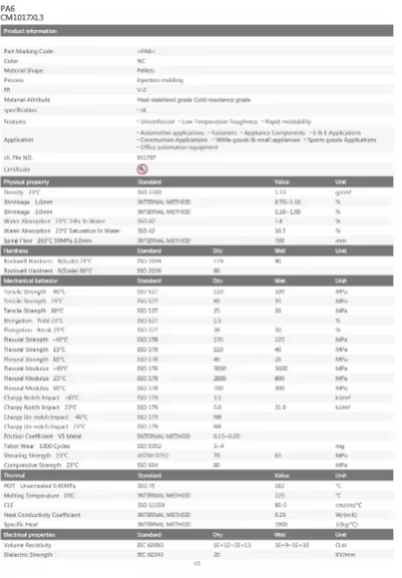 | As a specific PA6 product, it has excellent mechanical properties: PA6 CM1017XL3 has a high tensile modulus, tensile strength and bending modulus, which makes it suitable for manufacturing parts that need to withstand high stresses. Good processing performance: PA6 PX08321 has good molding processability and can be processed by injection molding, blow molding and other ways, which provides flexibility for manufacturers. Wide range of uses: it can be used to produce sports equipment, power tool accessories, automotive parts, etc., with general-purpose uses, can meet the needs of different industries. |